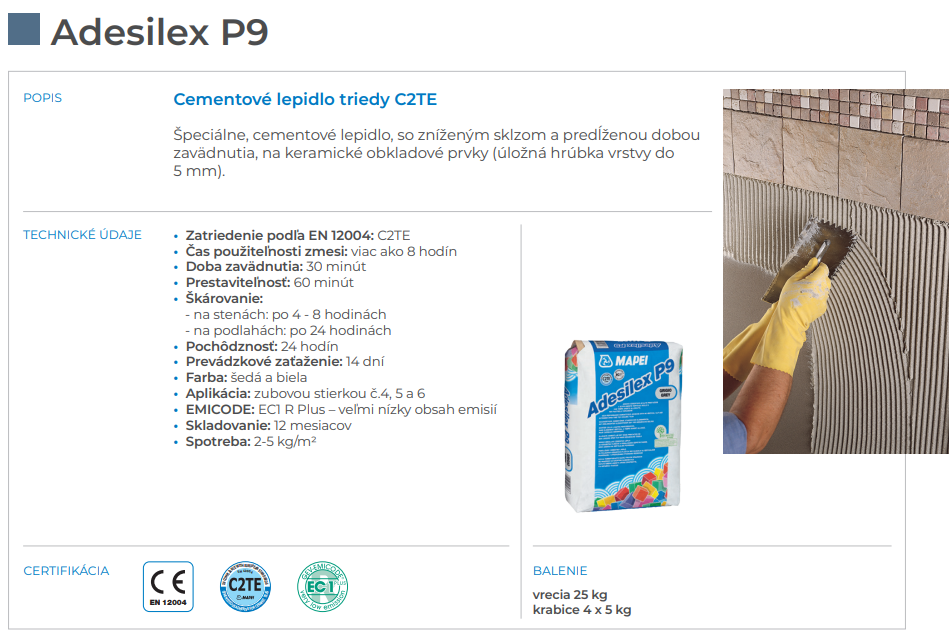 Trieda: C2TE podľa EN 12004 (vysoký výkon, flexibilita, predĺžená doba otvárania).