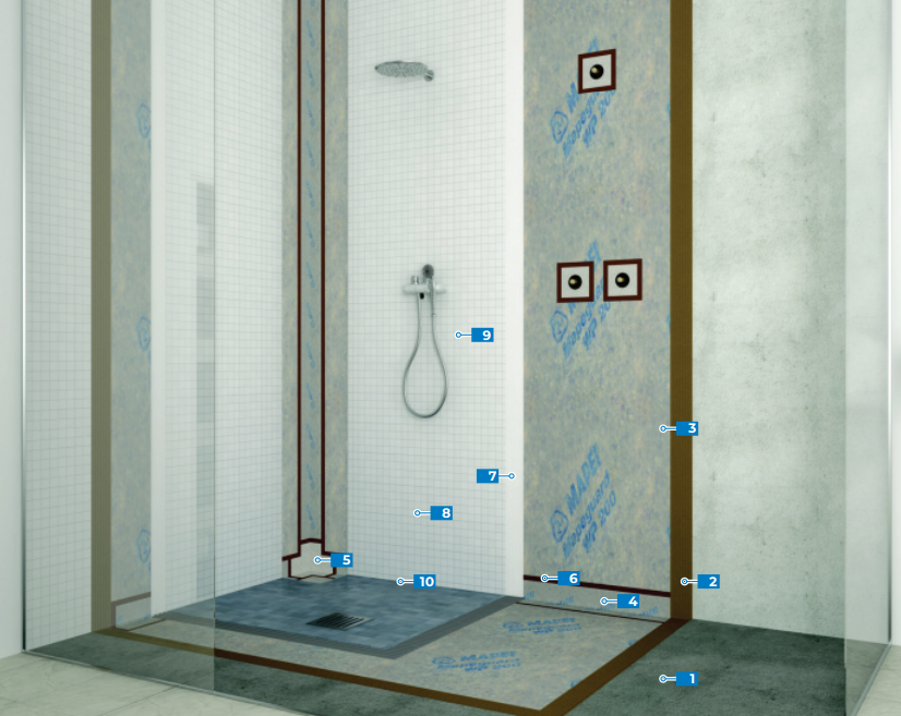 Hydroizolačný systém s deliacou membránou Mapeguard WP 200 poskytuje komplexnú ochranu proti vode a prasklinám. Vďaka vysokej pružnosti, odolnosti voči alkalickému prostrediu a kompatibilite s výrobkami MAPEI je ideálnym riešením pre sprchy, kúpeľne a iné vlhké priestory, kde je potrebné spoľahlivé a dlhodobé utesnenie povrchu.