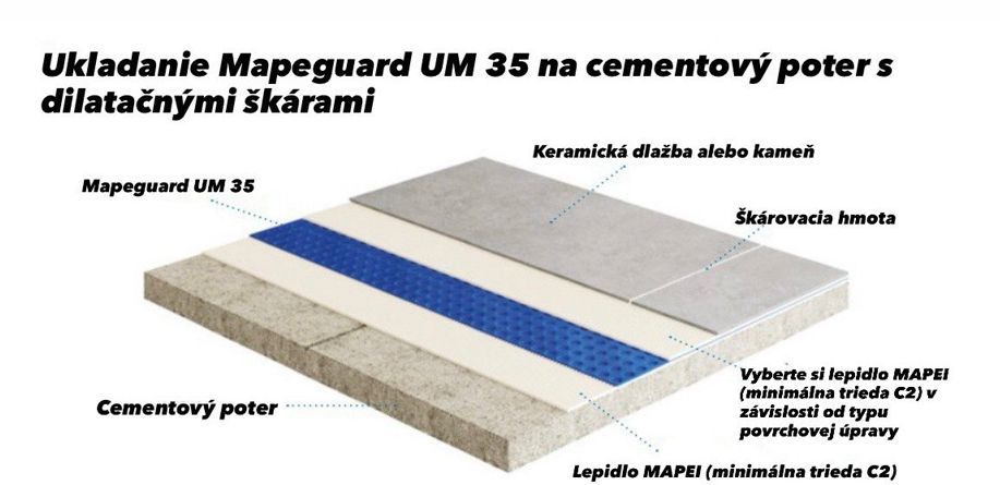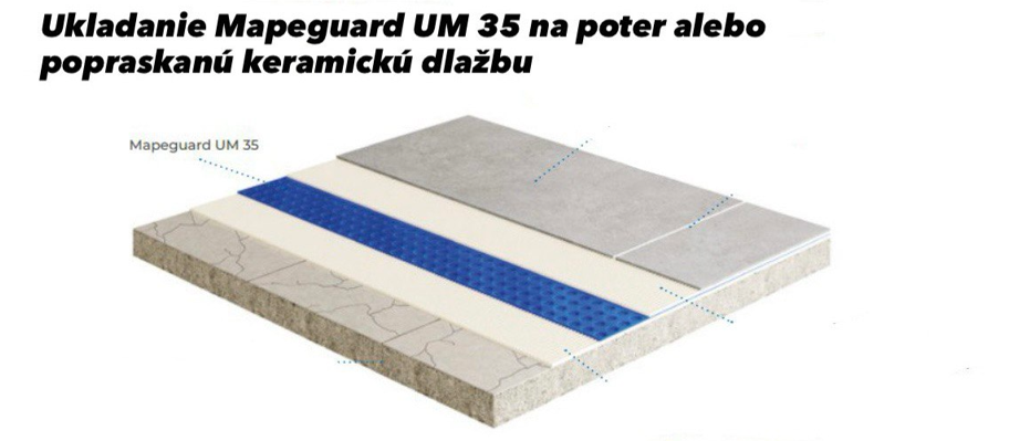 Mapeguard UM 35 je membrána na báze polyetylénu s vysokou hustotou (HDPE) so štruktúrou v tvare buniek, s vrchným zdrsneným povrchom a podkladom z polypropylénovej tkaniny. Umožňuje obkladať keramikou a kameňom väčšinu stavebných podkladov, dokonca aj problémových a/alebo tých, ktoré nespĺňajú požiadavky noriem.