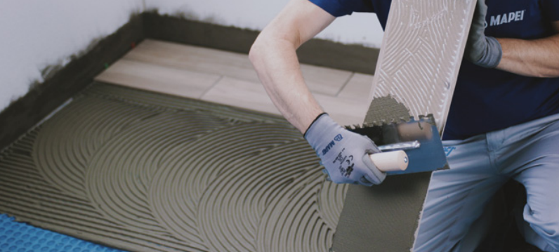 Lepidlo rozotrite po povrchu podkladu pomocou zubového hladidla (napr. so zubami 6 mm). Použite zdokonalené lepidlo MAPEI triedy C2 podľa noriem EN 12004 alebo GOST 56387, napr. Ultralite S2, Keraflex Maxi S1, Keraflex Extra S1, Keraflex, ADESILEX P9.