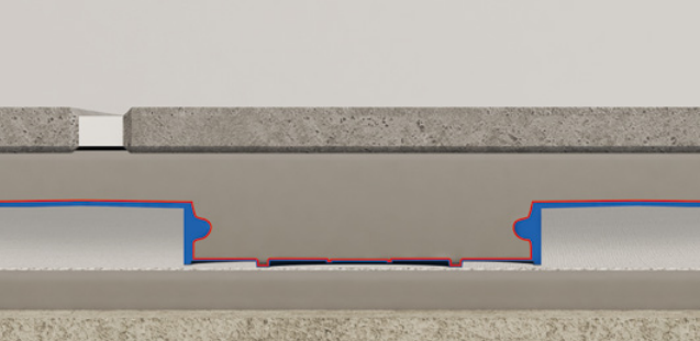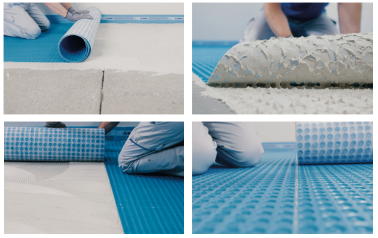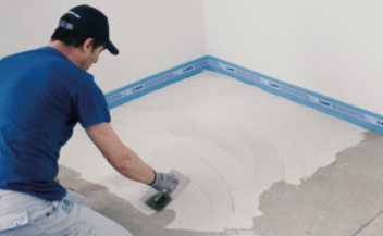 pokládka Mapeguard UM 35 na popraskanú keramickú dlažbu s dilatačnými škárami.