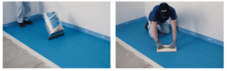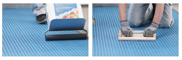 Hladkou stranou hladidla naneste prvú vrstvu lepidla, aby ste vyplnili preliačeniny v membráne, potom použite zubové hladidlo v súlade s formátom dlažby.