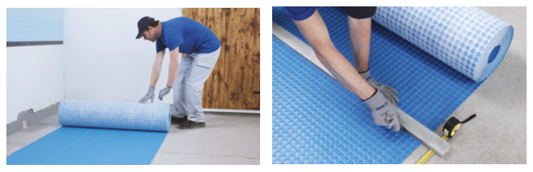 Membránu rozrolujte a narežte podľa tvaru a veľkosti miestnosti, pričom zohľadnite steny, sokle, stĺpy, odtokové otvory a pod.