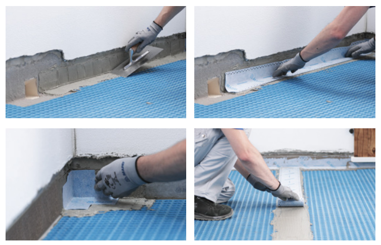 Utesnite spoje medzi jednotlivými pásmi membrány, ako aj všetky styky a rohy medzi membránou a stenami pomocou pásky Mapeband Easy, ktorá sa vkladá do lepidla Mapeguard WP Adhesive (napr. naneseného zubovým hladidlom 4 mm).