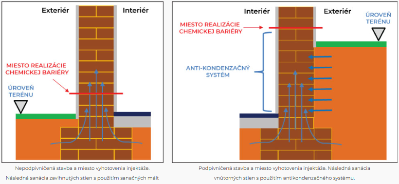 Používajú sa chemické mikroemulzie na silan-siloxanovej báze – napríklad MAPESTOP, aplikované nízkotlakovo alebo gravitáciou do navŕtaných otvorov.