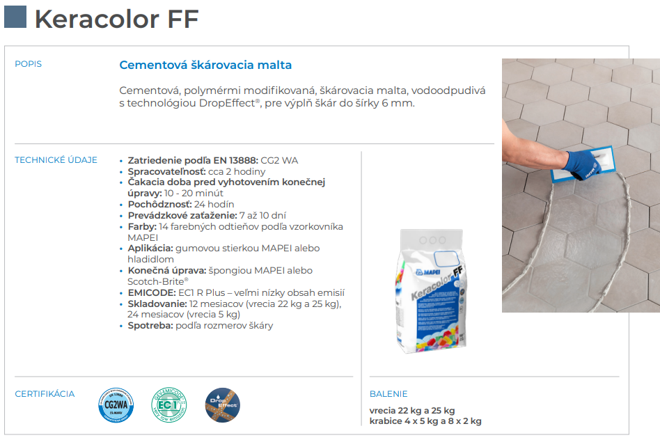 Keracolor FF je vysoko kvalitná cementová škárovacia hmota s jemnou štruktúrou, navrhnutá pre profesionálne použitie pri škárovaní keramických obkladov, dlažieb a mozaík v interiéroch aj exteriéroch. Svojimi parametrami spĺňa požiadavky triedy CG2WA podľa normy EN 13888, pričom vyniká nielen vysokou odolnosťou voči oderu a vlhkosti, ale aj estetickým vzhľadom a jednoduchou údržbou.