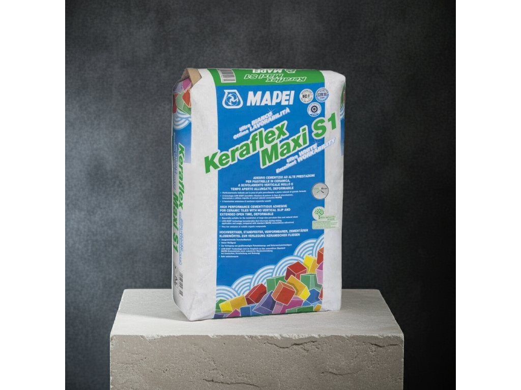 Keraflex Maxi S1 je prášková zmes vyrobená podľa špeciálnej receptúry, zložená z cementu, jemného triedeného kameniva, vysokokvalitnej syntetickej živice a ďalších špeciálnych prísad. Lepidlo je bezprašné vďaka inovatívnej technológii Low Dust od Mapei. Umožňuje lepenie v nedostatočne vetraných priestoroch prípadne v obývaných priestoroch, kde je nutné znížiť prašnosť na úplné minimum.