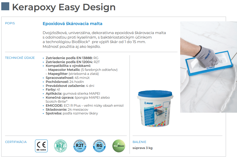 Kerapoxy Easy Design je dvojzložková, univerzálna dekoratívna škárovacia malta a lepidlo vyrobené na báze epoxidovej živice, s obsahom sklenených mikroguličiek a iných špeciálnych zložiek. Podľa normy EN 13888 je klasifikovaná ako škárovacia malta na báze reakčnej živice v triede RG; a podľa normy EN 12004 ako špeciálne (2) lepidlo na báze reaktívnych živíc (R) so zníženým sklzom (T), klasifikované ako lepidlo triedy R2T. Kerapoxy Easy Design má veľmi nízky obsah prchavých látok (VOC), čo potvrdzuje aj pozitívne stanovisko Asociácie pre kontrolu emisií podlahových krytín (GEV) udelením certifikátu v triede EMICODE EC1-PLUS.
