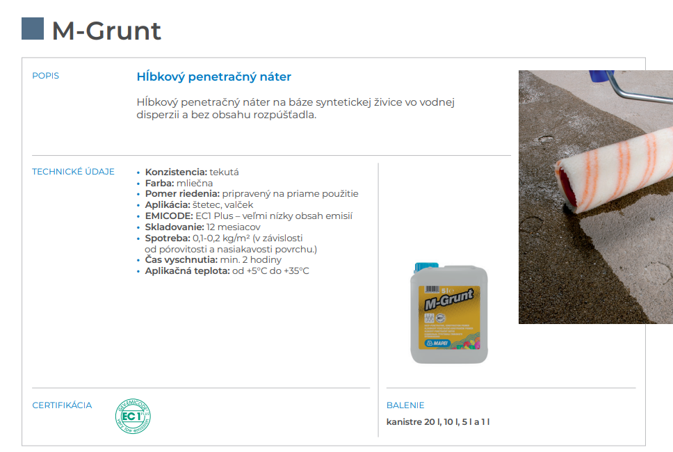 M-Grunt je profesionálny penetračný náter na vodnej báze, pripravený na okamžité použitie. Vyvinutý na báze vysoko kvalitnej syntetickej živice vo vodnej disperzii, vyniká svojou výnimočnou penetračnou schopnosťou a extrémne nízkym obsahom prchavých organických látok (VOC), čo potvrdzuje certifikácia EMICODE® EC1-PLUS. Produkt je bez rozpúšťadiel, bez zápachu a bezpečný pre aplikáciu aj v slabo vetraných priestoroch.