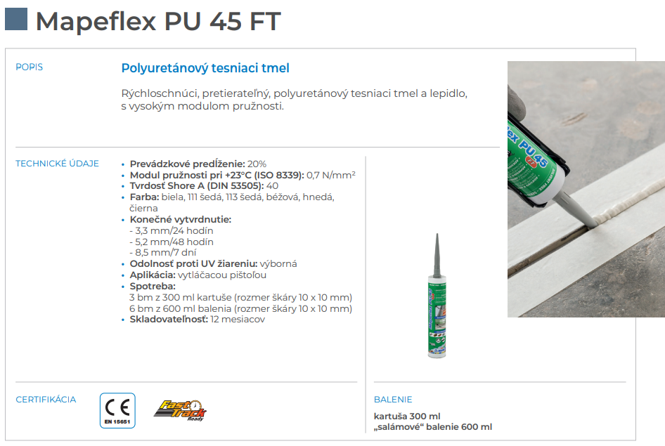Mapeflex PU 45 FT je vysoko výkonný, jednozložkový, tixotropný polyuretánový tmel a zároveň konštrukčné lepidlo, určené pre široké spektrum stavebných aplikácií. Vďaka svojej vynikajúcej mechanickej odolnosti, pružnosti a rýchlemu vytvrdzovaniu je ideálnym riešením pre tesniace a lepiace práce na horizontálnych aj vertikálnych povrchoch, v interiéri aj exteriéri. Bez obsahu rozpúšťadiel a zápachu, je bezpečný a komfortný pri aplikácii aj v uzavretých priestoroch.