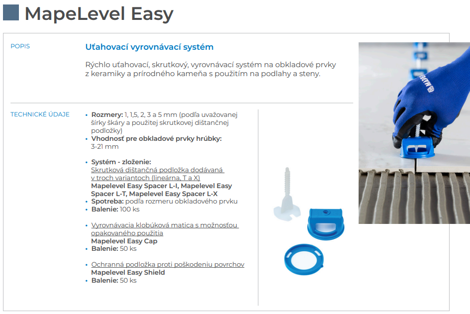 MapeLevel EasyClick System je moderný nivelačný systém navrhnutý pre jednoduché, rýchle a presné vyrovnanie keramických a kamenných obkladových prvkov. Vďaka špeciálnemu klik mechanizmu zabezpečuje jednotnú šírku škáry a dokonalú rovinatosť obkladov, čo eliminuje vznik nerovností medzi susediacimi dlaždicami. Systém je vhodný na podlahy aj steny a je obzvlášť praktický pri inštalácii veľkoformátových obkladov.
