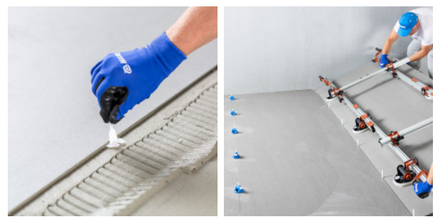 Naneste lepidlo a vložte skrutkové dištančné podložky MapeLevel Easy Spacer L pod dlažbu.
