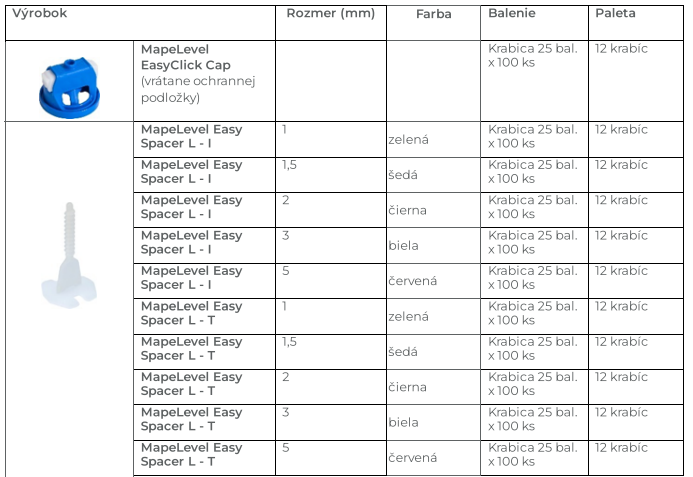 MapeLevel EasyClick System je moderný nivelačný systém navrhnutý pre jednoduché, rýchle a presné vyrovnanie keramických a kamenných obkladových prvkov. Vďaka špeciálnemu klik mechanizmu zabezpečuje jednotnú šírku škáry a dokonalú rovinatosť obkladov, čo eliminuje vznik nerovností medzi susediacimi dlaždicami. Systém je vhodný na podlahy aj steny a je obzvlášť praktický pri inštalácii veľkoformátových obkladov.