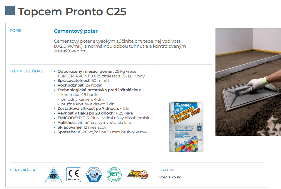 Topcem Pronto C25 je vopred namiešaný cementový poter pripravený na okamžité použitie, vyrobený na báze špeciálnych hydraulických spojív a kvalitného kameniva s optimálnou granulometriou. Vyznačuje sa rýchlym tvrdnutím, jednoduchou aplikáciou a vysokou mechanickou odolnosťou. Spĺňa normu EN 13813 a je klasifikovaný ako CT - C25 - F5 - A1fl.