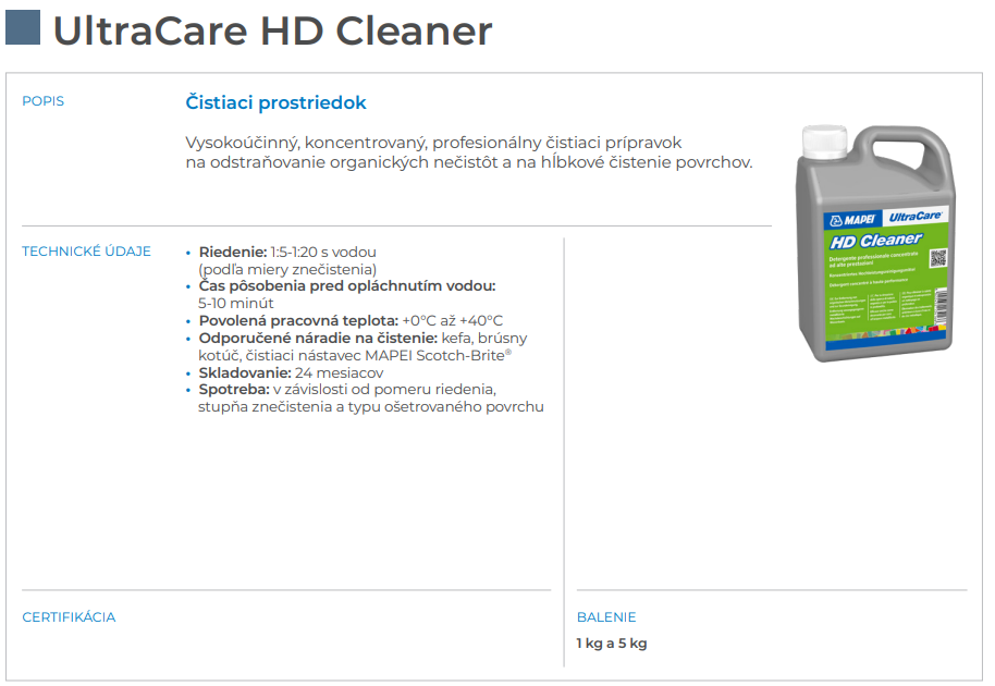 UltraCare HD Cleaner je koncentrovaný profesionálny čistiaci prostriedok vyvinutý na dôkladné hĺbkové čistenie a odmasťovanie rôznych typov povrchov. Vďaka svojmu špeciálnemu zloženiu účinne odstraňuje organické nečistoty, mastnotu, škvrny, staré voskové vrstvy a zvyšky ochranných alebo montážnych náterov, ktoré sa často nachádzajú na nových keramických obkladoch.