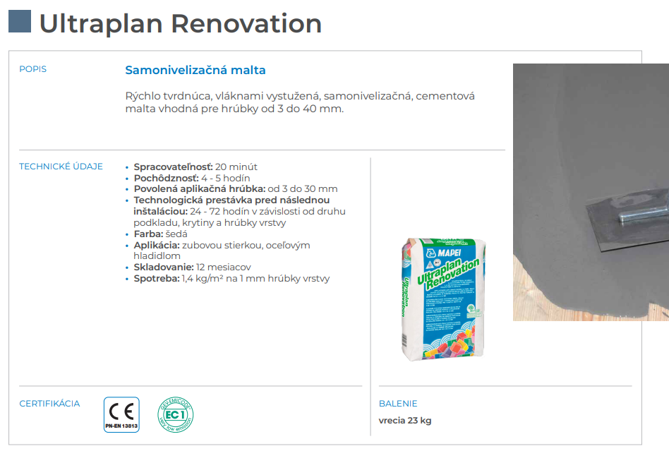 Ultraplan Renovation je moderná, samonivelizačná cementová zmes určená na vnútorné použitie, špeciálne vyvinutá na vyrovnávanie a vyhladzovanie nerovností podláh v hrúbke vrstvy od 3 do 40 mm. Je ideálnym riešením pre nové aj rekonštruované podlahy v obytných budovách, komerčných objektoch a verejných priestoroch, kde sa očakáva vysoká prevádzková záťaž – vrátane plôch vystavených valivému zaťaženiu (napr. stoličky s kolieskami). Vďaka výbornej kompatibilite s podlahovým vykurovaním je vhodná aj do moderných energeticky efektívnych interiérov.